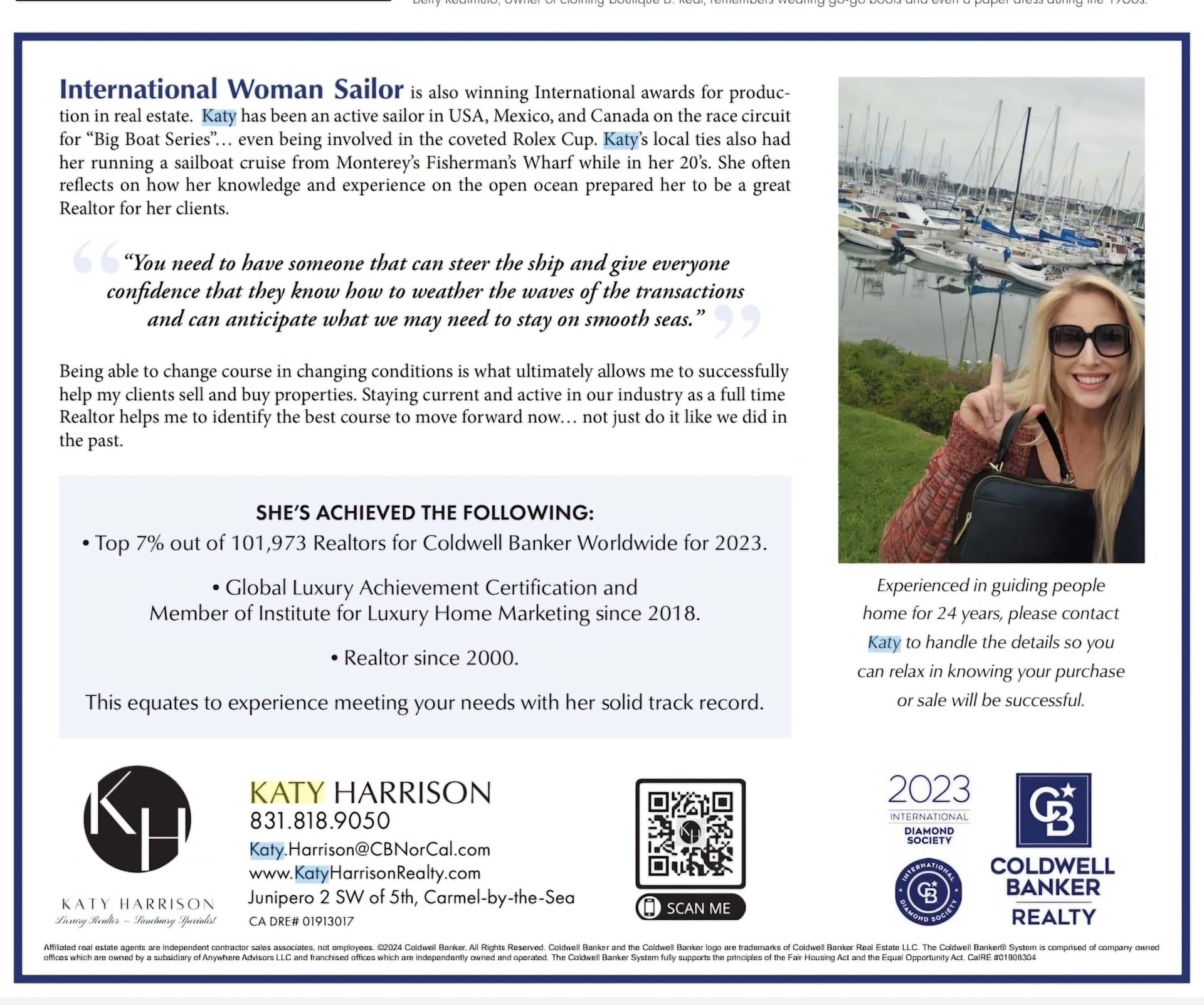 Katy’s local ties also had her running a sailboat cruise from Monterey’s Fisherman’s Wharf while in her twenties. She often reflects on how her knowledge and experience on the open ocean had prepared her to be a great Realtor for her clients.